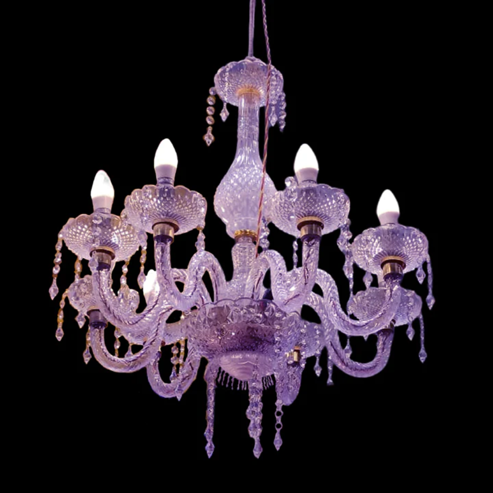 - Decorative light that hangs from the ceiling and has several parts like branches for holding light bulbs.